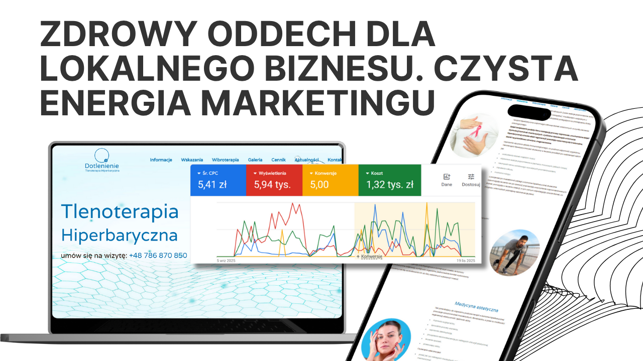 Jako DynaSite specjalizujemy się w skalowaniu biznesów usługowych poprzez precyzyjne kampanie performance. Dla marki Dotlenienie.pl, oferującej profesjonalną tlenoterapię hiperbaryczną, wdrożyliśmy strategię marketingu lokalnego. Naszym celem było nie tylko zbudowanie świadomości marki, ale przede wszystkim maksymalizacja liczby umówionych wizyt przy zachowaniu optymalnego budżetu.